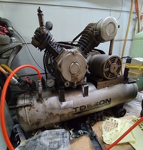 比較的新しいエアーコンプレッサーの調子がずーっと悪くて、古い機械に頼り切っていたのですが、今日の朝、当社でも高齢の方のベテラン機械からオイルが吹き出して圧力が高まらなくなってしまいました。それだけでなく周辺はオイルまみれに・・・