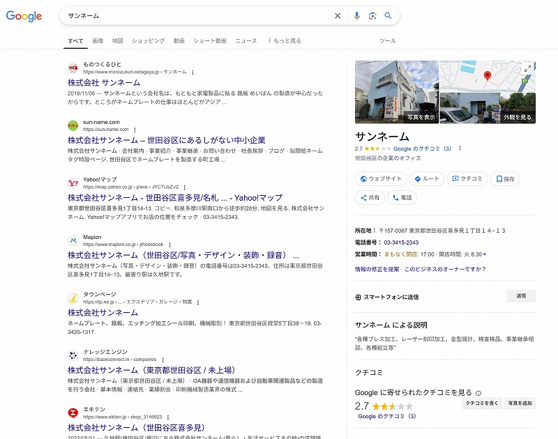 ふと気づいたのですが、Google検索で『サンネーム』と入れると当HPが『ものつくるひと』のページ直後の2位に浮上してました!