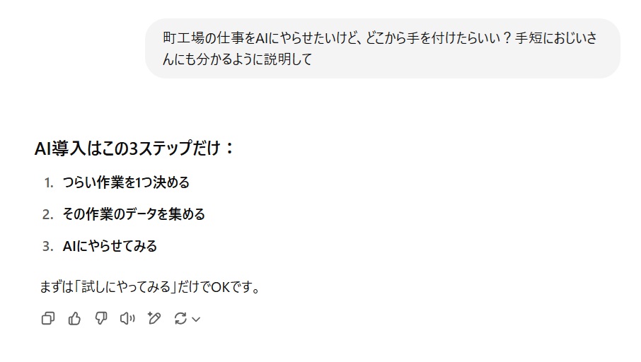 というわけで、さっそくAIにどこから手を付けたらいいか聞いてみましょう。